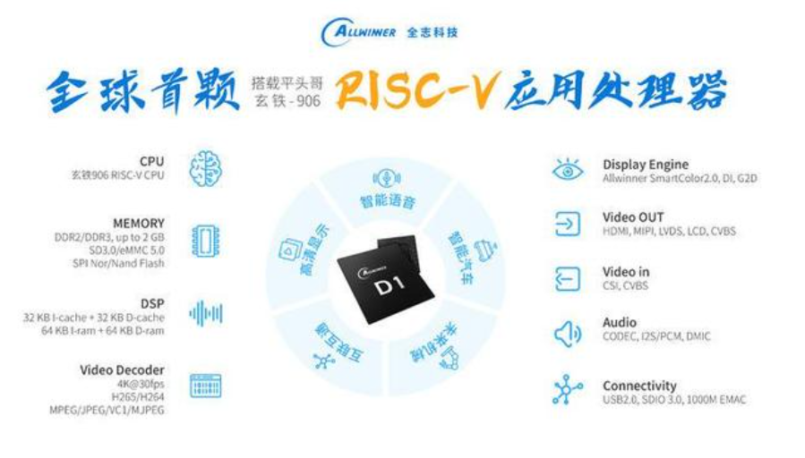 全志科技今日宣布推出「D1」处理器,其是全球首颗量产的搭载平头哥玄铁906 RISC-V的应用处理器,为万物互联AIoT时代提供了新的智能关键芯片。